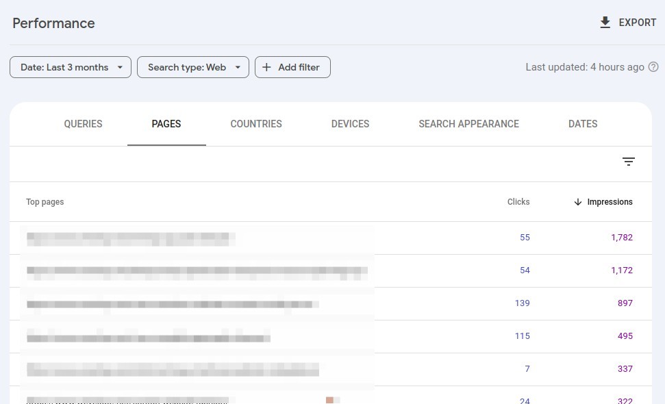 Di bagian Performance > Pages, Anda bisa melihat halaman mana yang paling banyak muncul di hasil pencarian dan mendapatkan klik.