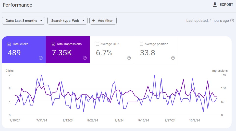 Pergi ke Performance > Search Results untuk melihat performa situs di hasil pencarian Google.