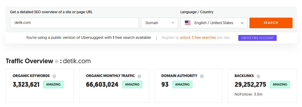 Ubersuggest ini tidaklah gratis, namun ada batasan penggunaan 3 kali dalam sehari. Jadi, anda bisa memanfaatkan fitur gratis terbatas ini.