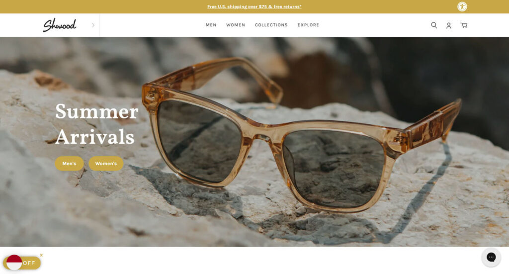 Website bisnis ini memiliki kategorisasi yang rapi dengan foto-foto produk yang menarik dan detail sehingga membuat pengunjung betah berlama-lama. Bukan hanya fokus ke branding, Shwood Eyewear juga sangat mementingkan fitur pembelanjaan, terbukti dengan ditampilkannya fitur review, gratis ongkir, dan dukungan marketplace di halaman depan.