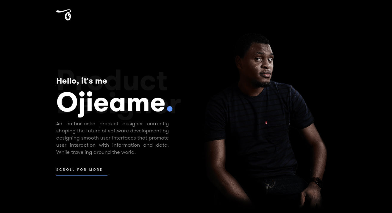 Website sederhana didominasi dengan warna hitam. Tegas dengan konten pengenalan dan disambut dengan skillset yang dia punya.