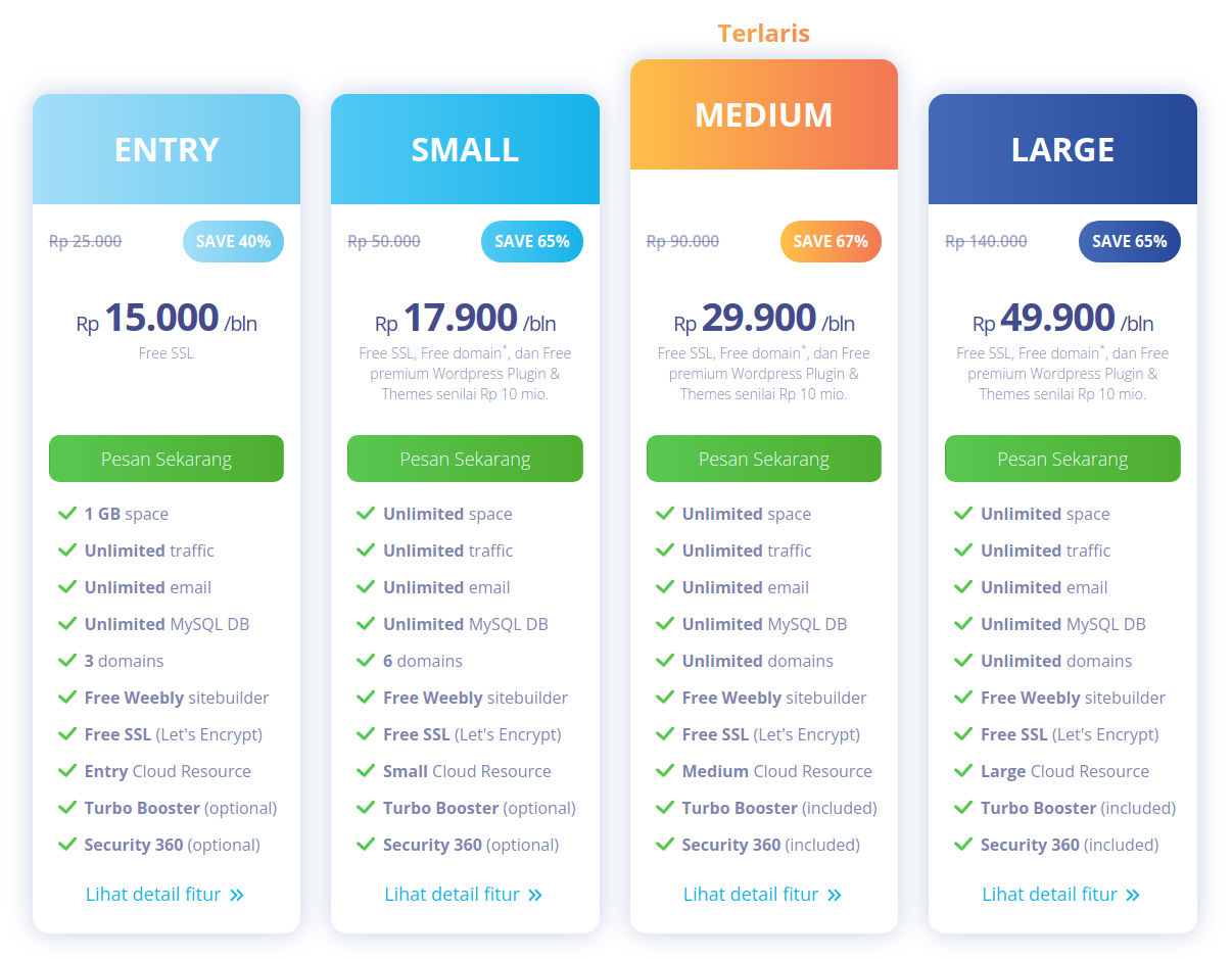 Anda bisa lihat, setiap harga memiliki fiturnya masing-masing. Silakan memilih sesuai dengan kebutuhan. Jangan terlalu besar ataupun terlalu kecil. Pilihlah yang optimal saja, karena kedepannya bisa diupgrade kok.